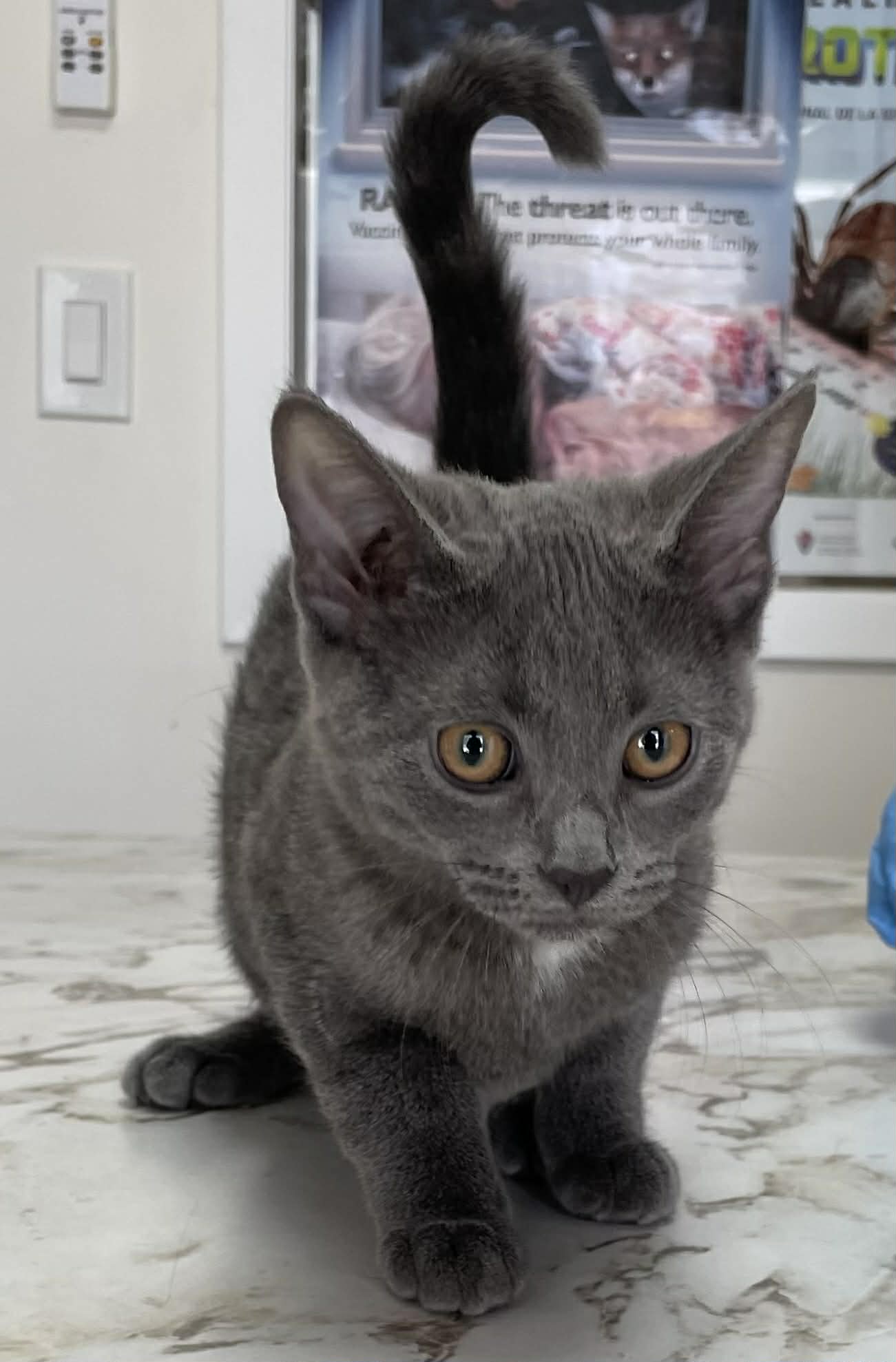 She is a beautiful grey girl with a small white patch on her chest and deep golden eyes.